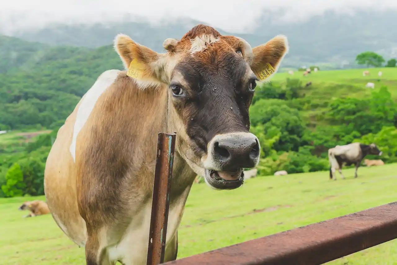 ジャージー牛は一般的な乳牛のホルスタインと比べて、飼育頭数が少なく、体が小さく、搾乳量も少ないので、牛乳の大量生産には向いていないと言われますが、雪ヶ峰牧場では、「ジャージー乳のおいしさを知ってほしい」という想いで飼育しています。ジャージー乳は、濃厚でコクがあり、栄養価が高いのが特徴です。 |
