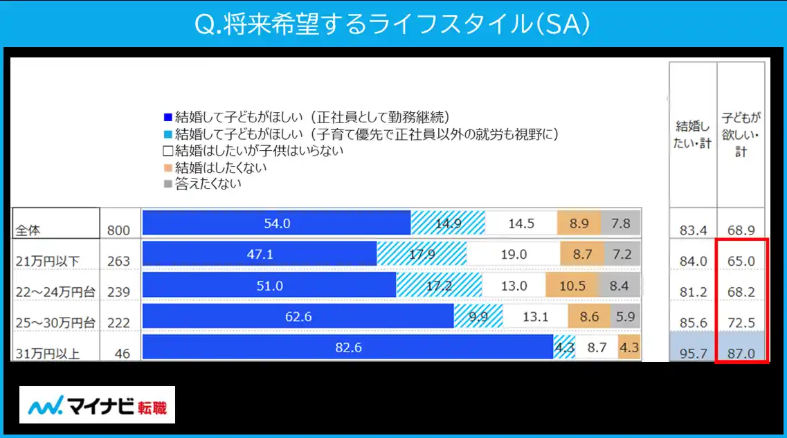子どもが欲しい割合を月収別で見ると、月収21万円以下は65.0%に留まる一方、31万円以上では87.0%と約9割にのぼり、月収別で差も見られた。 |