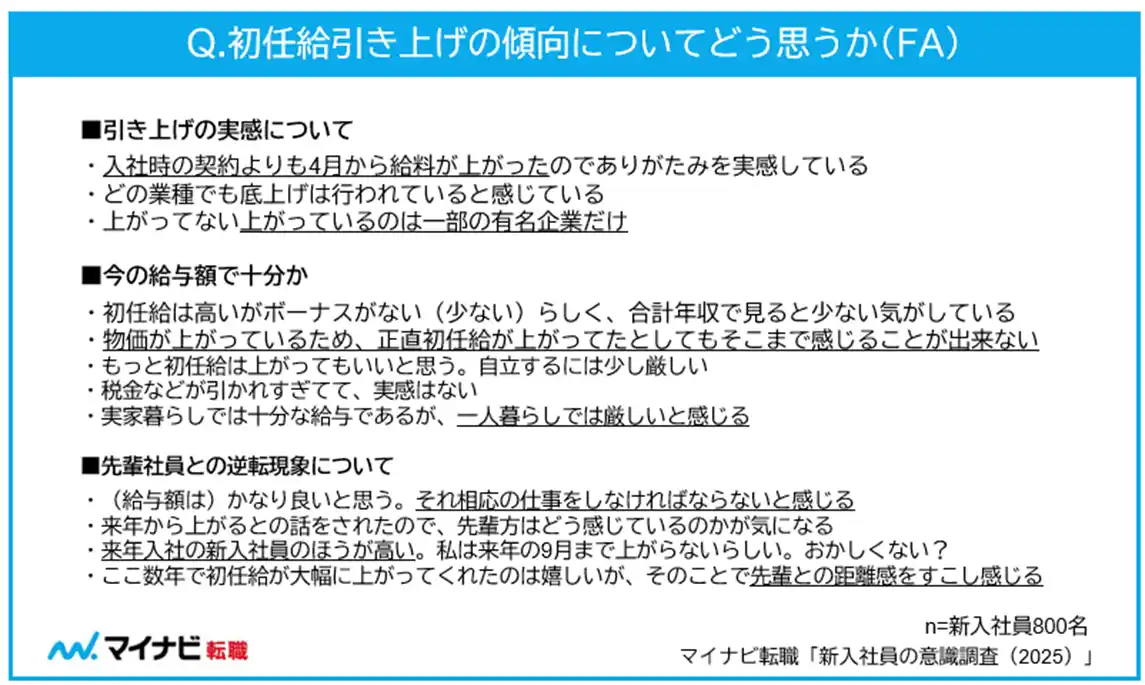 初任給上昇についての自由回答をみると、「嬉しい」「どの業種でも底上げされていると感じる」という意見の一方で、「物価上昇や税金などで引かれあまり実感はない」「上がったのは一部の企業だけ」「一人暮らしは厳しい」との意見もみられた。 |