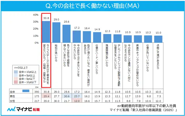 勤続意向年数が10年以下と回答した人に、理由を聞くと、「ライフステージに合わせて働き方を変えたいから」が最多で、特に女性は35.0%と男性より10pt近く高く、他の理由と比べて大きく差が見られた。 |
