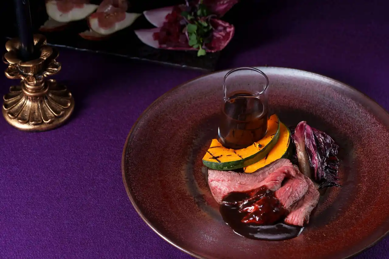 ブラック・パープル・オレンジなどのハロウィンカラーを纏った秋の食材が並ぶ「Halloween High Tea」。メインディッシュには、芳醇な黒にんにくのソースが赤身の旨味を際立たせる、A5等級仙台牛のランプ肉ローストをご用意。ハイティースタンドのオードブルには、オマール海老のベニエや、いちじくと生ハムのタルティーヌ、鮪とビーツのタルタルなどをハロウィンカラーでアレンジした6品が並びます。デザートは、カシスクリームを閉じ込めたモンブラン仕立てをほろ苦いキャラメルアイスクリームとともにお召し上がりください。また、オプションにて、オリジナルハロウィンカクテルを含む、アルコールフリーフロープランもご用意しております。 |