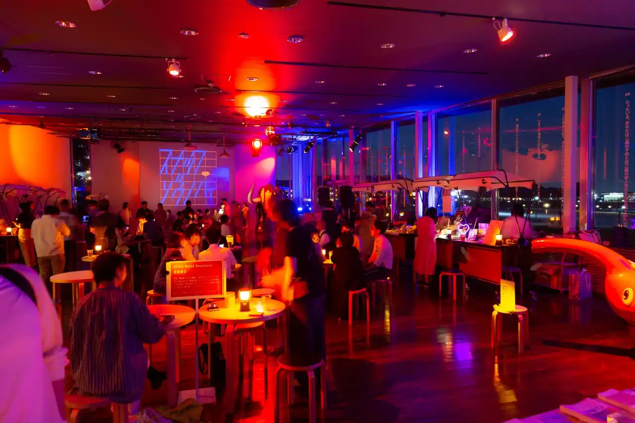 象の鼻テラスでは、2025年7月から9月にかけて、夜間の賑わい創出を目指し、アート・音楽・市民参加型プログラムを組み合わせた「夜まで楽しい“象の鼻テラス”」を多彩に展開しています。国際アートフェア「Tokyo Gendai」の開催に合わせて実施するのは、人々の出会いと交流を生み出すサロン「スナックゾウノハナ」。アーティストがママ/マスターとなり、来場者とお酒を片手に、直接対話できる機会です。総勢約12組のアーティストたちが集結し、妖しい光に包まれた異色な空間の中、多彩なゲストとトークを楽しむスナックブースとダンスフロアがカオティックに交差します。 |
