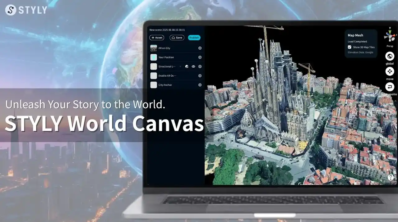「STYLY World Canvas」は、2025年6月にリリースされた新ソリューションです。STYLYが提供する「STYLY Studio」から世界中のロケーションを指定するだけで、3Dマップを読み込んで誰でも即座に世界中にXR体験を展開することができます。 |