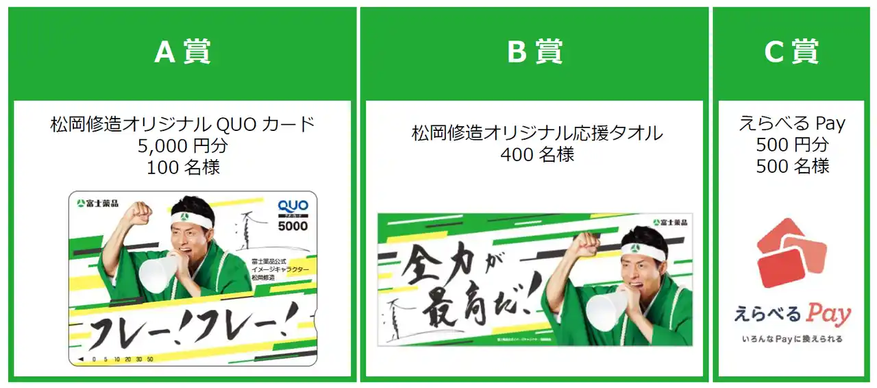 賞品は以下の3種類です。A賞・B賞は今回のキャンペーンに合わせた松岡修造さん書き下ろしの応援メッセージ入りデザインです。 |