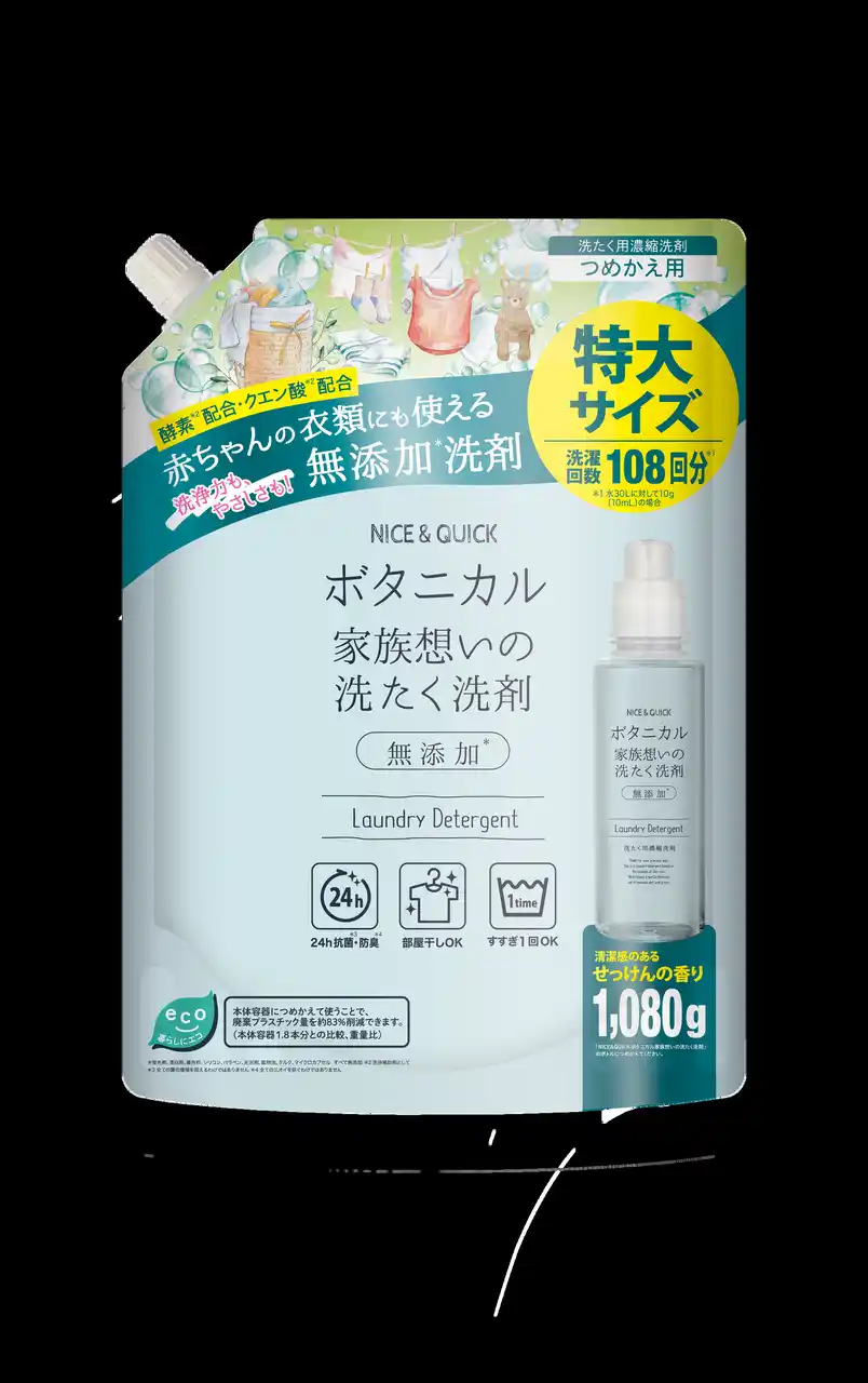ボーテ・ド・モード株式会社(所在地:東京都港区)は、「NICE & QUICK(ナイスアンドクイック)」より、赤ちゃんから大人まで家族みんなで使える 「ボタニカル家族想いの洗たく洗剤」 を新発売いたします。9月中旬からECサイト・全国のドラッグストア(一部店舗を除く)にて随時展開予定です。 |