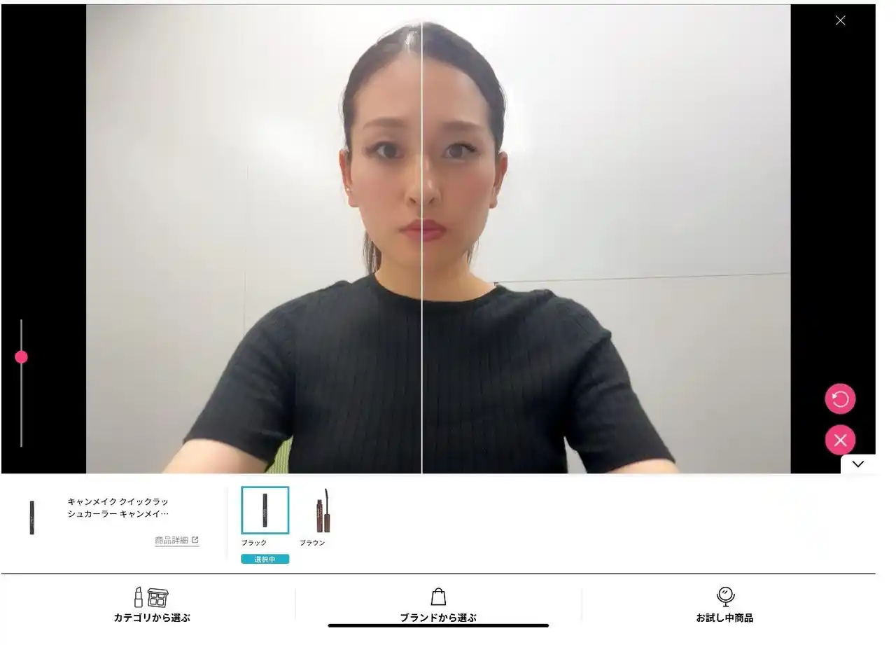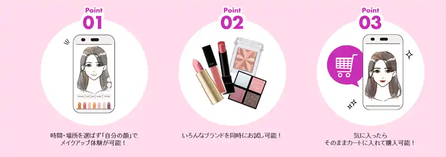 商品の現物が無くても、メイクの楽しさを体験する場を提供します。バーチャルメイクで気に入った商品はそのまま購入が可能です。 |