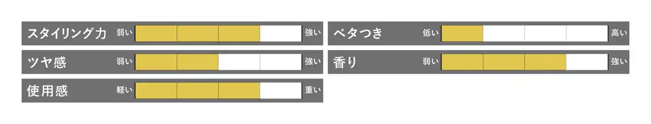 | ナチュラルにスタイリングしながらも、ベタつきは残さない、心地よい使用感です。 | |||||||||||