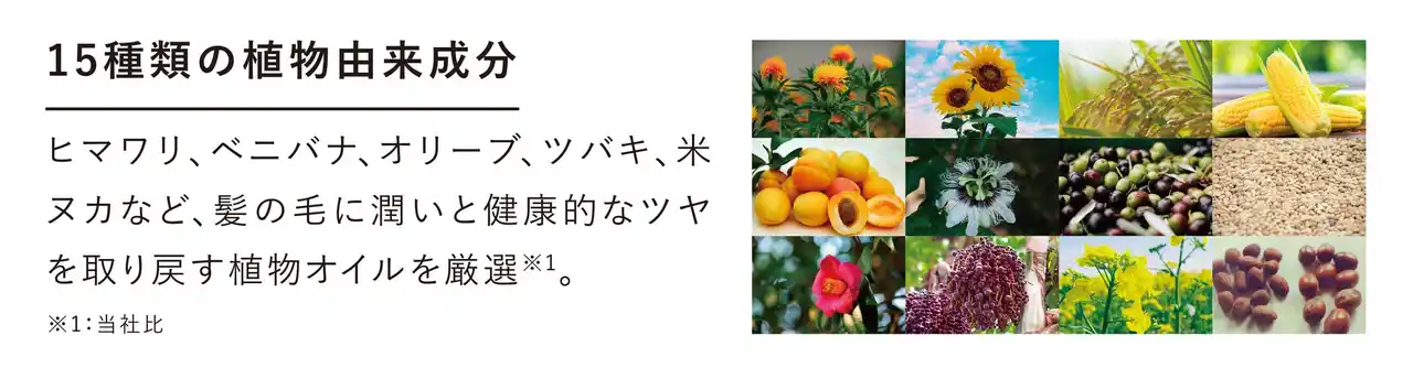 | 環境負荷の高いシリコンや鉱物油は使用せず、厳選*した15種の植物エキスを独自にブレンド。 | |||||||||||