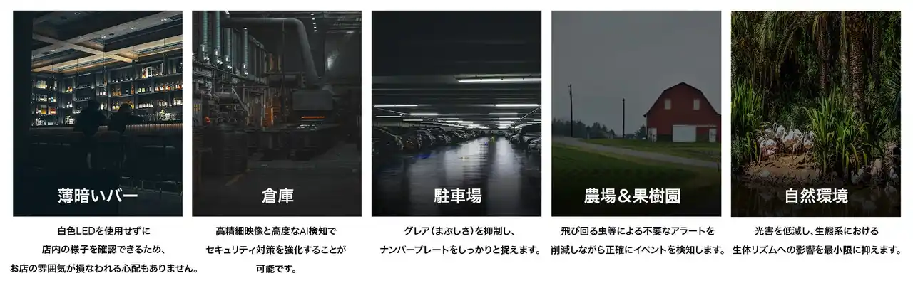 スポットライトを使用しないことで、ライト周辺を飛び回る虫による不要なアラートや消費電力を抑えられ、環境にも配慮した監視が行えます。 |