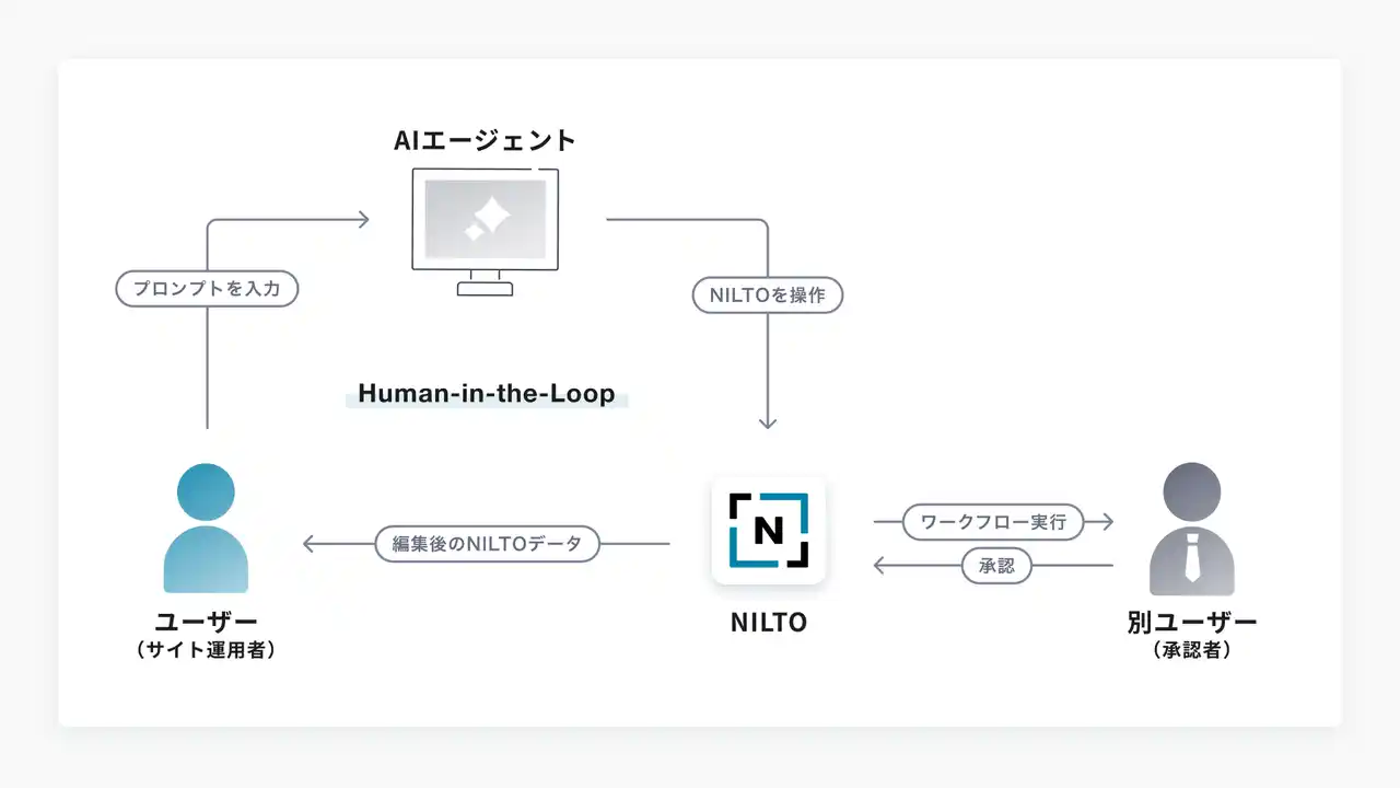 NILTO MCPは、AIによる効率化を最大限享受しつつ、人間にしかできないことは人間が対応する、という人間とAIの理想的な協業体制を実現します。フェンリルは、このようなAIと人間の適切な役割分担に基づく協調関係を、「Human-in-the-Loop」の理想形と位置付けています。 |