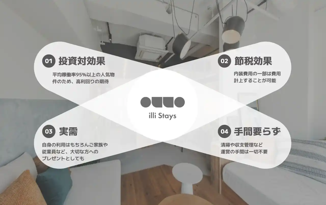 投資家様には、物件オーナー様と賃貸契約を締結していただき、入居保証金や内装施工費など、入居に必要な初期費用をご負担いただきます。ホテル運営はすべてBNSが担当するため、 提携パートナー様は毎月のレポートを確認するだけです。 また、初期コストの減価償却による節税効果へのアプローチに期待でき、宿泊料収入からの利益分配、さらに「illi Stays」を所有することで、ご自身やご家族が実際に宿泊利用できるといった、単なる収支を超えた付加価値を体験していただけます。 |