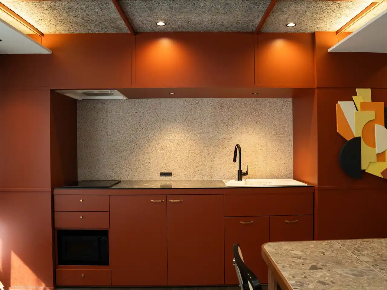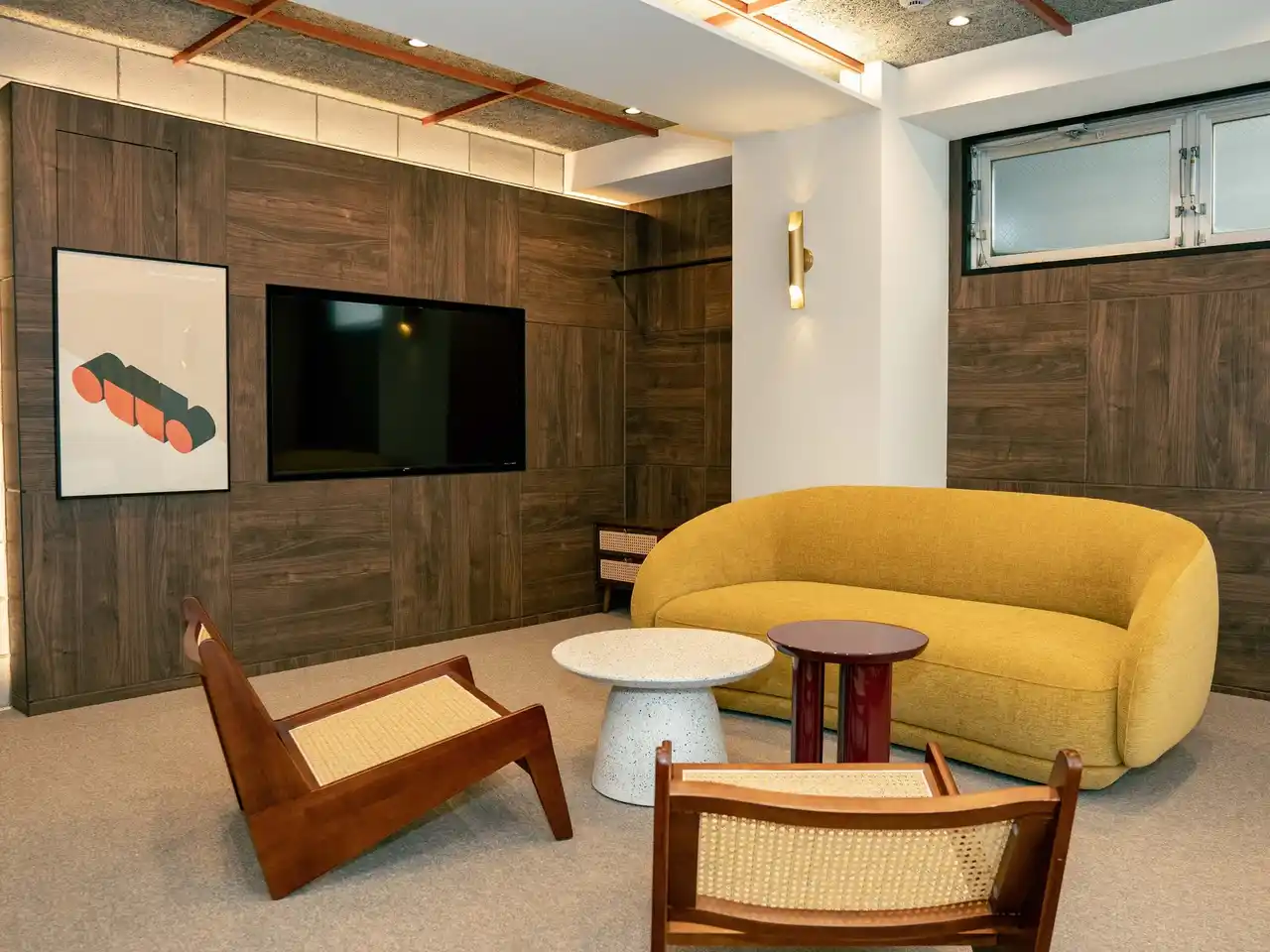 64平方メートル の広さを確保し、最大6名まで滞在可能。ミッドセンチュリーモダンをベースとした華やかで活気ある色彩に、格子天井の温もりや無骨なブロックタイルの質感が調和するデザインです。ダイニングやラウンジを囲むゾーニングが自然と会話を弾ませ、旅の時間を豊かに育みます。 |