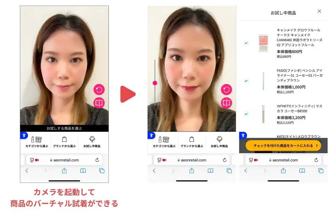 パーフェクト社が提供する「ARバーチャルメイク」は、イオンの公式通販「イオンスタイルオンライン」にも導入されています。お客様は自宅にいながら店舗と同等の試着体験を楽しみ、気に入った商品はそのまま購入できます。 |