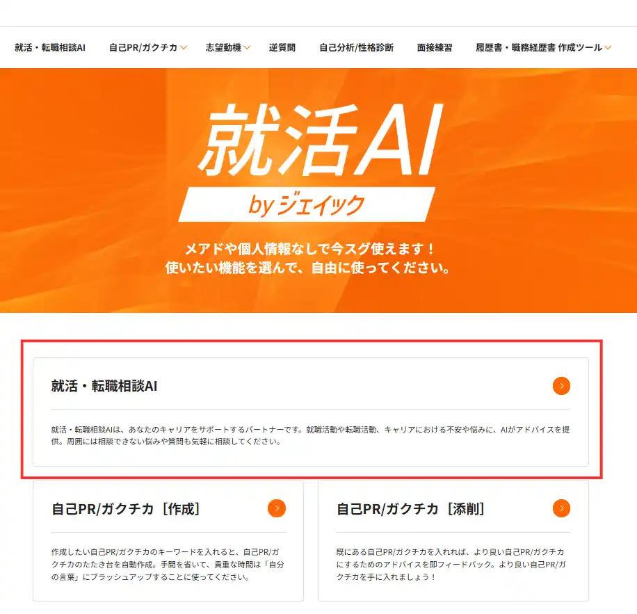 「就活AI」トップページにある「就活・転職相談AI」のメニューを選択してください。 |