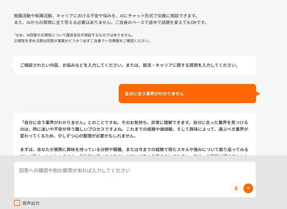 就職活動や転職活動、キャリアにおける不安や悩みを、チャット形式でAIに相談できます。(音声入力対応) |