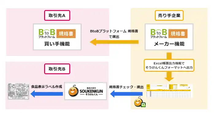 今回の商品規格書データ出力機能により、「BtoBプラットフォーム 規格書」で作成した商品規格書を、「食品大目付そうけんくん」に対応した「そうけんくん標準規格書(Excel規格書)」で出力することが可能になりました。これにより、「BtoBプラットフォーム 規格書」に一度商品規格書情報を登録しておけば、「BtoBプラットフォーム 規格書」と「食品大目付そうけんくん」、それぞれのフォーマットで複数の取引先へ提出することができるようになり、業務の効率化及び入力ミス防止につながります。 |