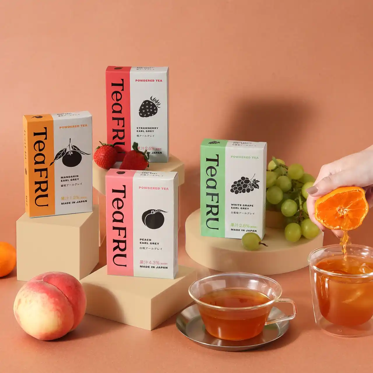 TeaFRUはそれぞれ特徴の異なる「白桃アールグレイ」「白葡萄アールグレイ」「蜜柑アールグレイ」「苺アールグレイ」の4種でスタートします。 |