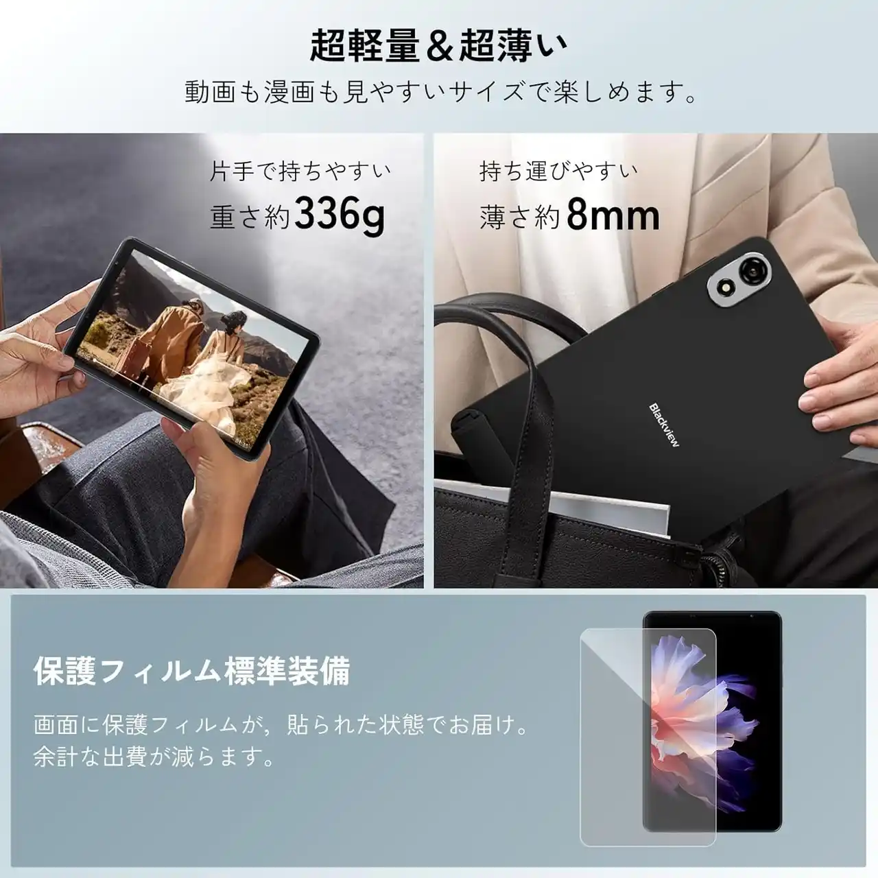 スリム&軽量デザイン+自立スタンドで持ち運びや動画視聴に最適 |