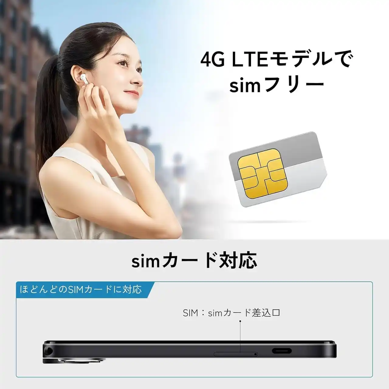 通信機能も充実。デュアルSIMに対応した4G LTEモデルのため、Wi-Fi環境がない場所でもモバイルネットワーク経由でインターネット接続が可能です。GPS、GLONASS、Galileoといった複数の測位システムをサポートし、外出時のナビゲーションや旅行シーンでも活躍します。 |