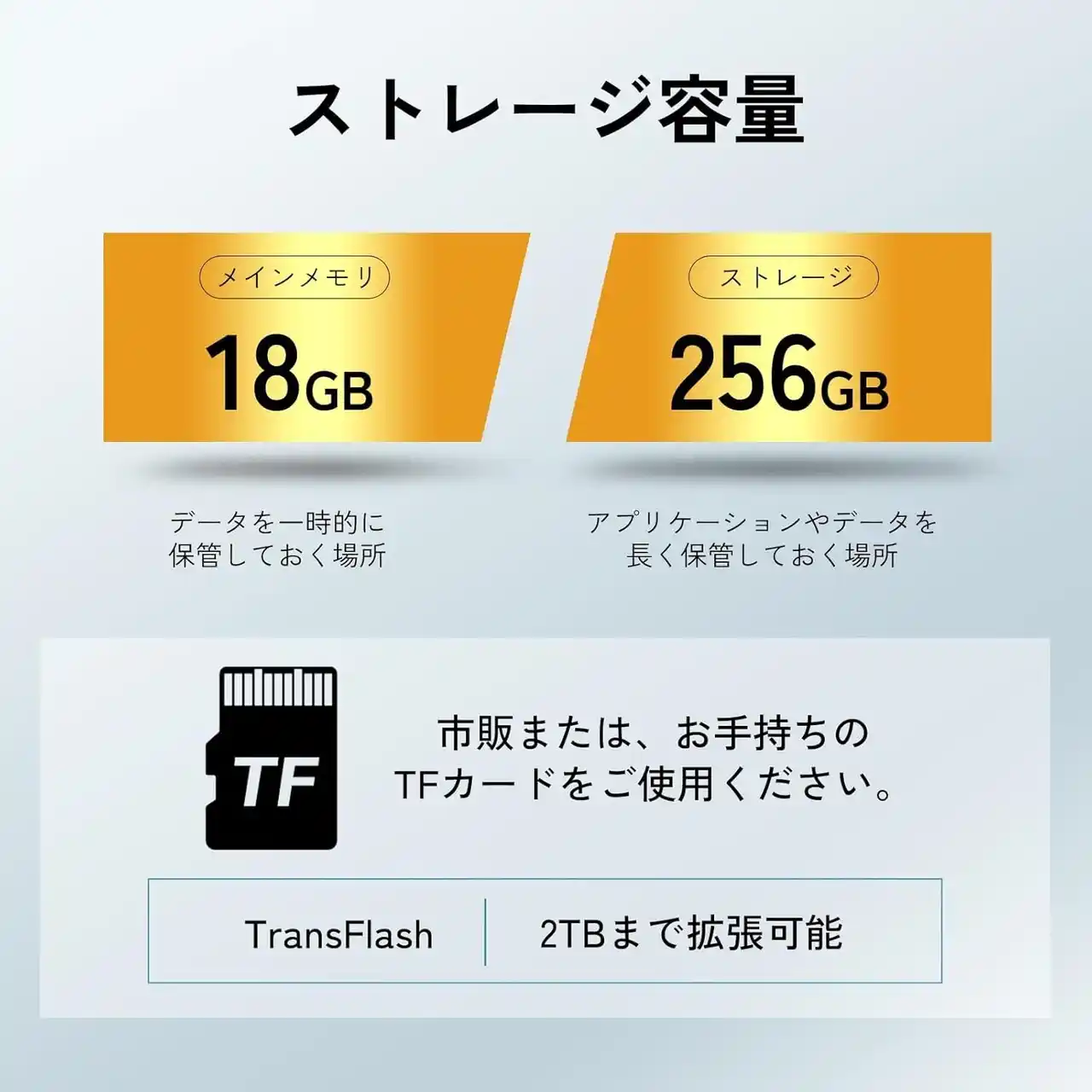 大容量ストレージ&最大2TB拡張対応でアプリも動画もたっぷり保存可能 |