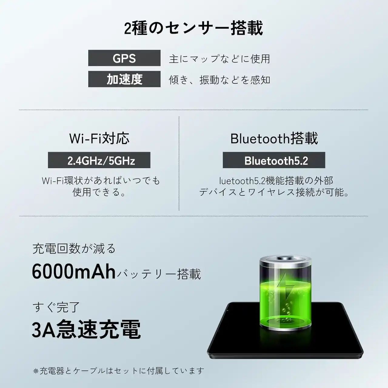 6,000mAhの大容量バッテリーを搭載しており、動画視聴やWebブラウジング、音楽再生といった日常利用を長時間楽しむことができます。急速充電にも対応しているため、外出前の短時間充電でも十分に活躍。さらにType-Cポートと3.5mmイヤホンジャックを備えており、充電しながら音楽を楽しむといった使い方も可能です。 |