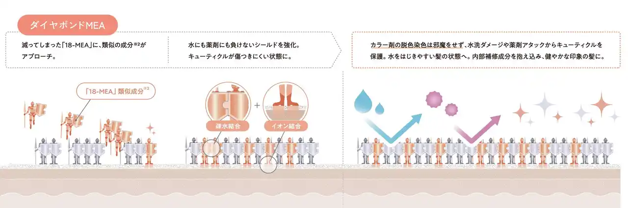 「ダイヤボンドMEA」は、ダメージを受けた後に補修をするだけではなく、髪を傷つきにくくする“未傷※1”という新発想のもと開発されました。18-MEAの類似成分※2がナノレベルでアプローチし、水や薬剤にも負けない構造を形成。水洗や薬剤によるダメージからキューティクルを保護しつつ、ヘアカラー剤の脱染脱色は邪魔せずに、水を弾きやすく健やかな髪の印象へと導きます。 |