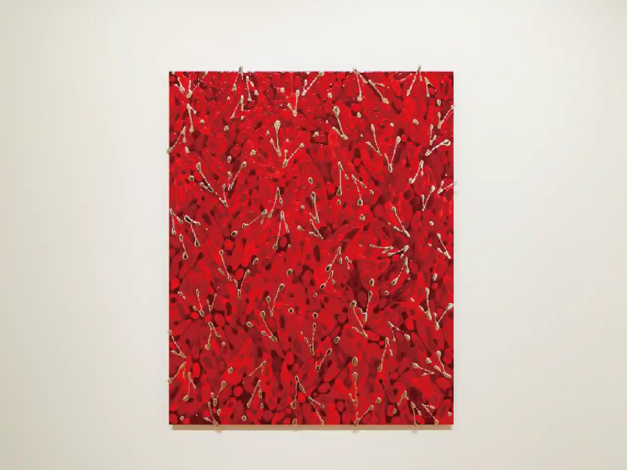 錫やエナメルを用いたミクストメディア作品には、流動的な質感を瑞々しいままに無機質である素材を立体的で肉感のある有機質に捉えなおした作風で、生命の根源エネルギーや、その起源が拡大していくさまを表現しています。 |