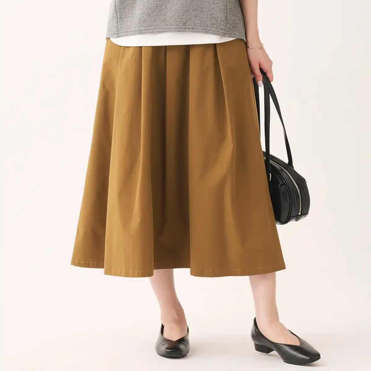 ふんわりと広がるAラインと、繊細なピンタックが上品な印象を与えるタフタスカート。軽やかな素材感と程よいハリ感で、動くたびに美しいシルエットを描きます。新色のキャメルは、温かみのあるカラーで秋冬のニットやアウターとも好相性。スニーカーでカジュアルに、パンプスでフェミニンにと、幅広いスタイリングが楽しめます。 |