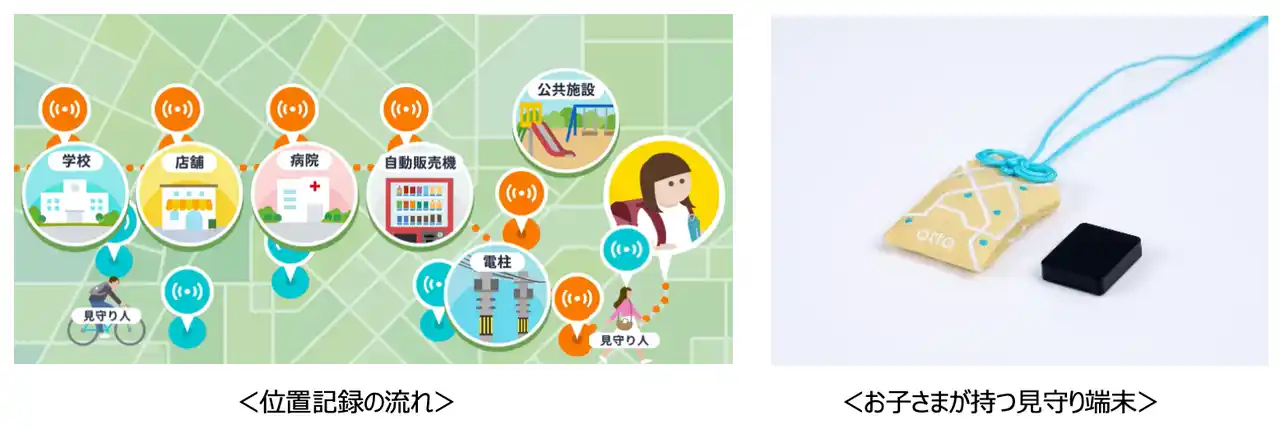 otta見守りネットワークは、駅や店舗、学校などの固定の見守りスポットに加え、「見守り人アプリ」を入れた地域住民のスマートフォンや、走行中のタクシーも移動型の見守りスポットとして活用。広い範囲をカバーする仕組みを整えています。見守り端末を持つ子どもが見守りスポットとすれ違う時に移動履歴が記録され、保護者アプリで確認が可能。さらに、警察など公的機関とも連携し、万が一の際の捜索支援にも対応しています。 |