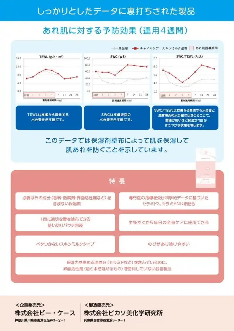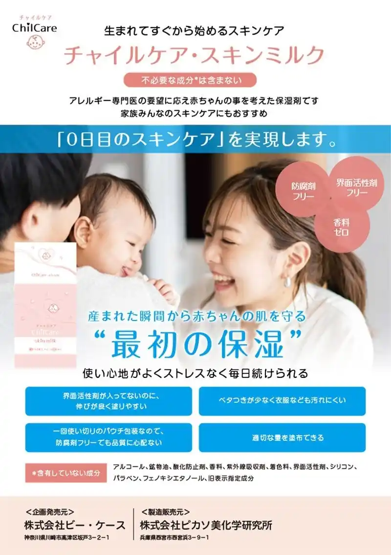 赤ちゃんの皮膚バリアーは非常に弱くデリケートです。保湿剤は長期にわたり使用されることが多く、その赤ちゃんの肌に今回の保湿剤チャイルケアスキンミルクを開発しました。チャイルケアスキンミルクで赤ちゃんの健やかな肌を守りたいと考えています。 |