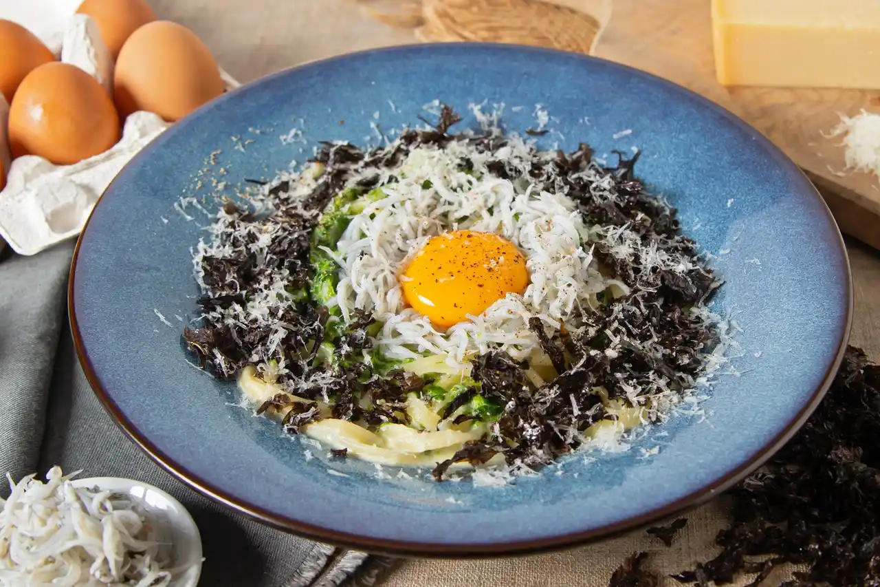 北坂たまごと淡路島産釜揚げシラスの旨味海苔カルボナーラ風 リングイネ |