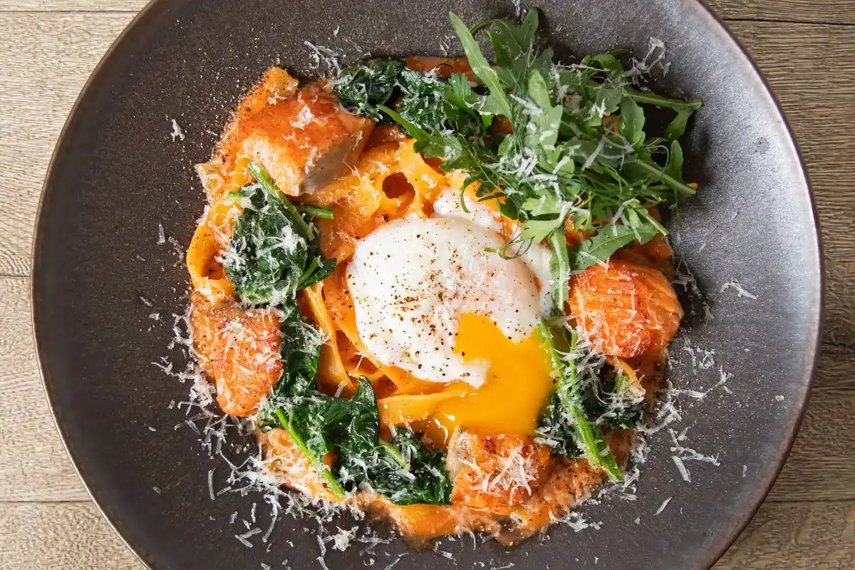 半熟に仕上げた北坂たまごと鮭のトマトクリームカルボナーラ風 フィットチーネ |
