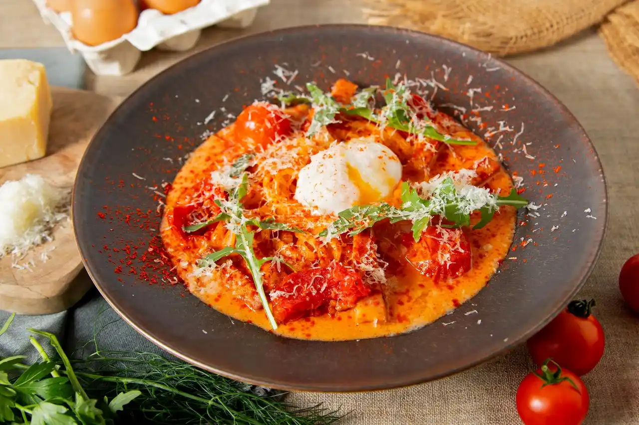 半熟に仕上げた北坂たまごと島ポモドーロのスパイス赤カルボナーラ風 リングイネ |
