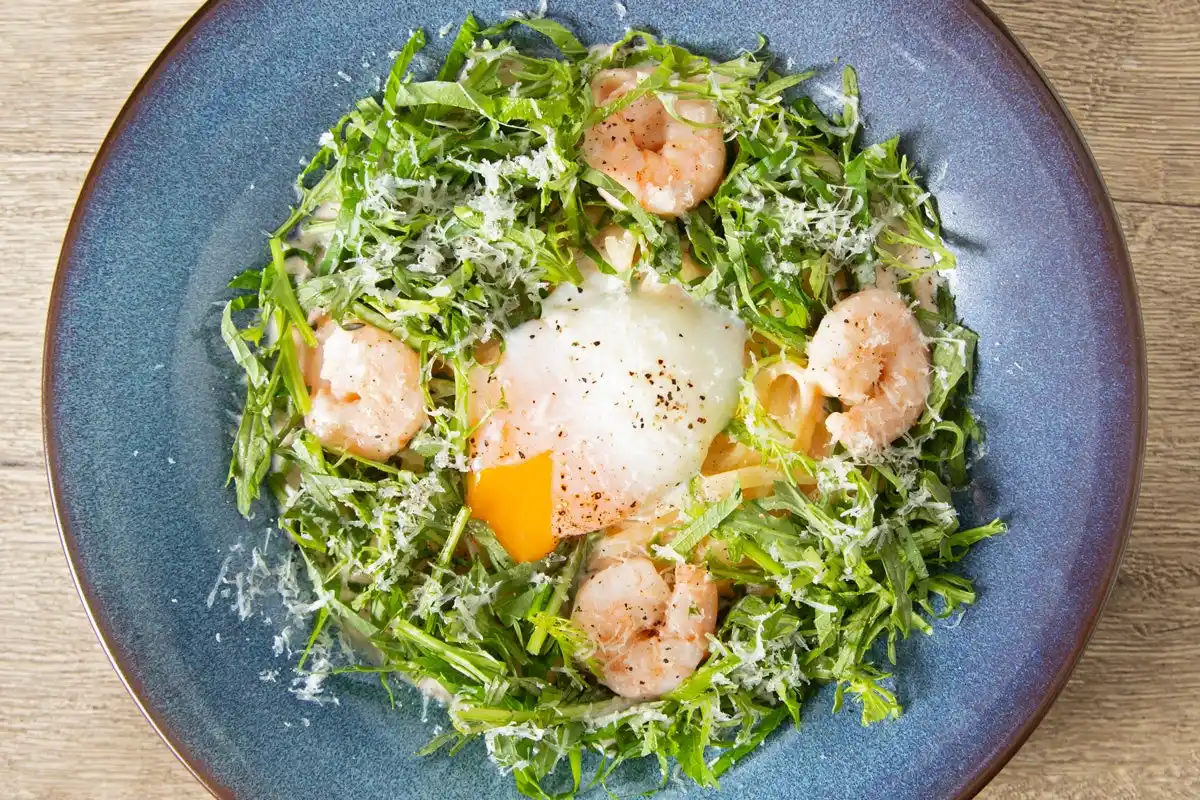 半熟に仕上げた北坂たまごと紫蘇、海老の明太子カルボナーラ風リングイネ |