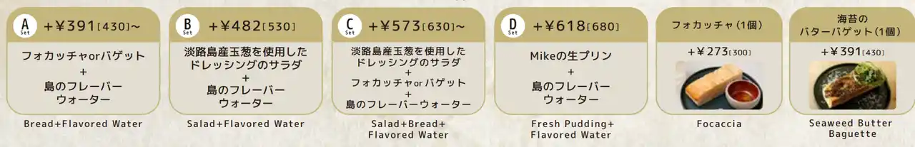 淡路島産玉ねぎのドレッシングで味わうサラダ、フォカッチャ、淡路島・北坂たまごの生プリン、フレーバーウォーターのドリンクバーなど、MIKE(ミケ)のパスタには、お好みのサイドメニューをセットするのがおすすめ。 |