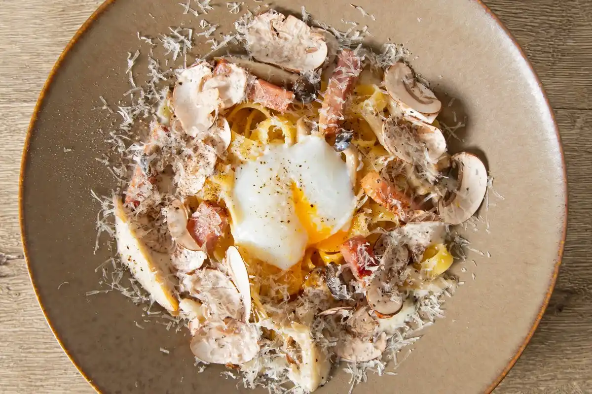 半熟に仕上げた北坂たまごとベーコンときのこのカルボナーラ風 フィットチーネ |