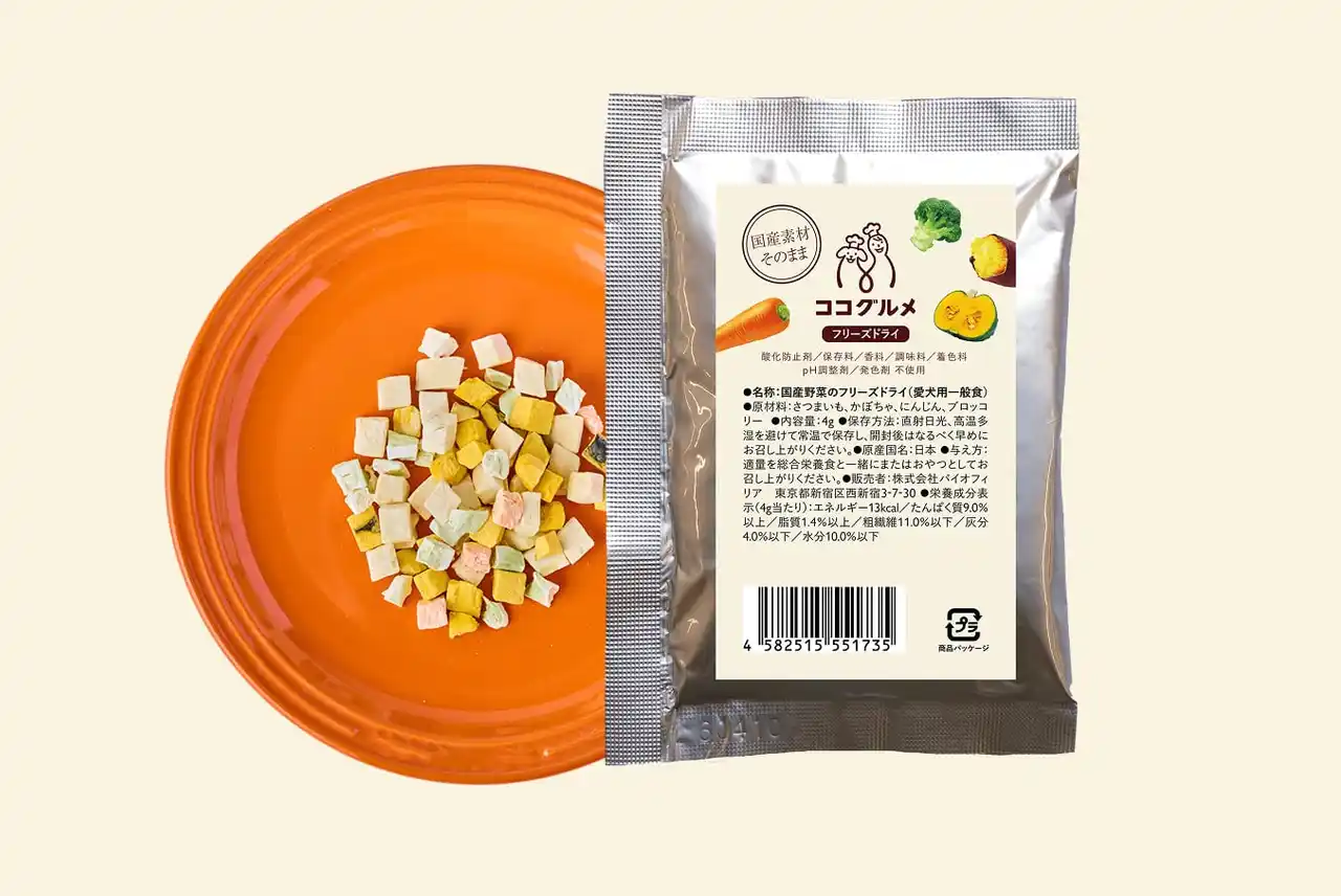 ココグルメ・ドライをよりおいしく食べてもらえるトッピング用のフリーズドライ野菜も同時発売。ココグルメに使用している原材料と全く同じ国産食材を、栄養素を極力壊さないようにフリーズドライにしました。トッピングはもちろん、おやつとしても使っていただけます。 |
