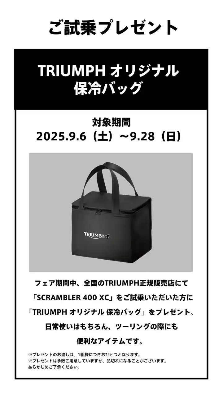 期間中、全国のTRIUMPH正規販売店にて「SCRAMBLER 400 XC」をご試乗いただいた方に「TRIUMPH オリジナル 保冷バッグ」をプレゼントいたします。 |