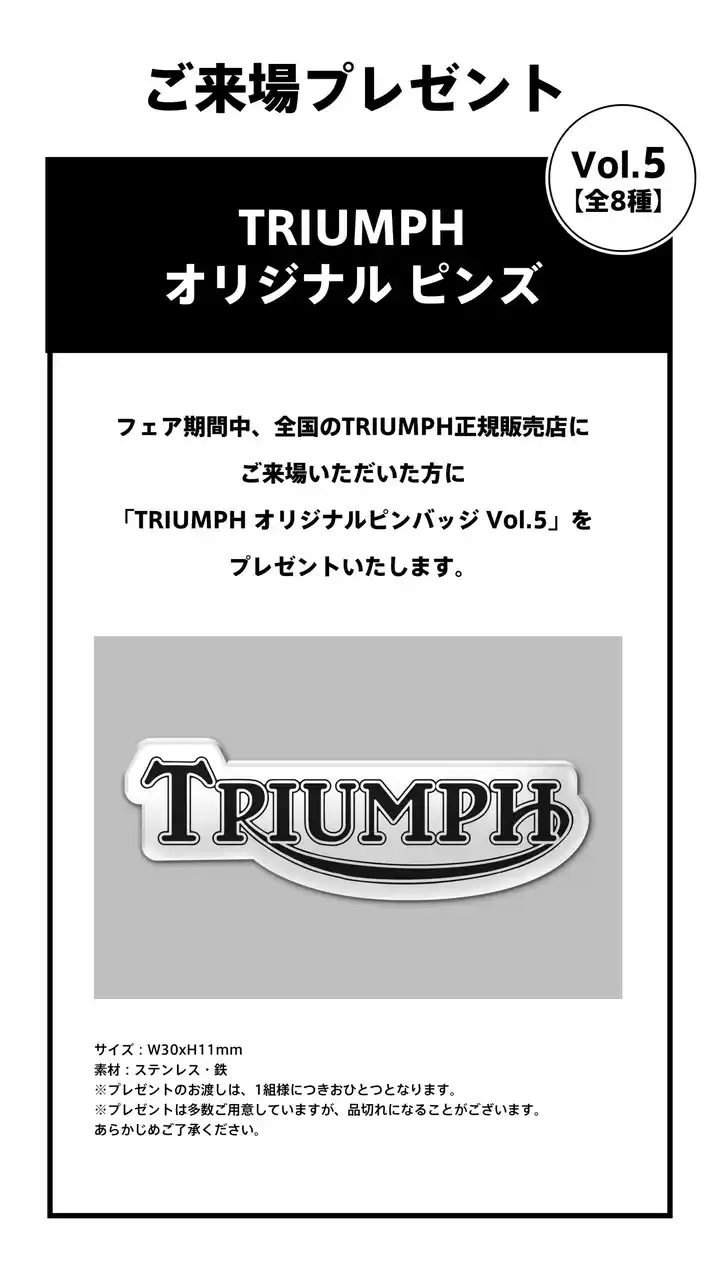 期間中、全国のTRIUMPH正規販売店にてご来場された方に、「TRIUMPH オリジナルピンバッジ Vol.5」をプレゼントいたします。 |