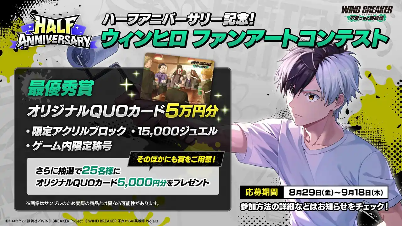 オリジナルQUOカード5万円分や15,000ジュエル、ゲーム内限定称号などが賞品として入手できるファンアートコンテスト。 |