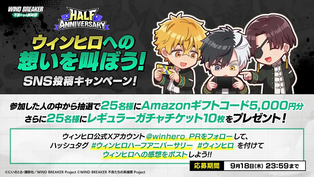 ハーフアニバーサリーを記念して、豪華キャンペーンを開催いたします。ジュエルやガチャチケットが貰えるキャンペーンや毎週当たるプレゼントキャンペーン、豪華賞品が手に入るファンアートコンテストなどを開催予定です。詳細はハーフアニバーサリー特設サイトをご確認ください。ぜひこの機会に『ウィンヒロ』を遊んでみてください。 |