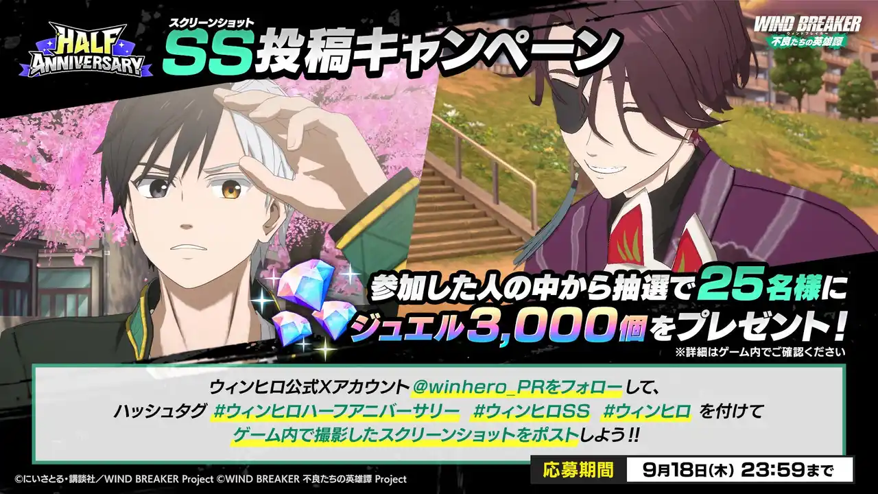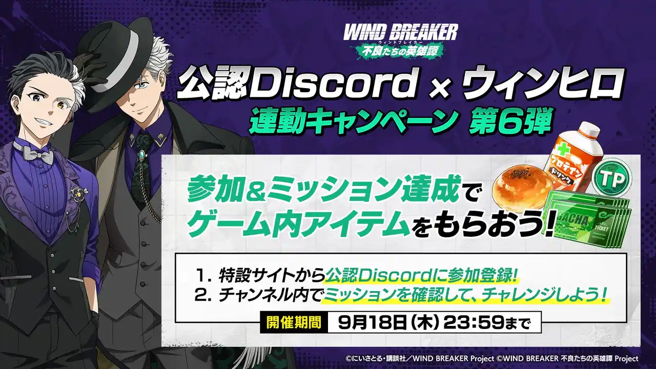 株式会社講談社(本社:東京都文京区、代表取締役社長:野間省伸)は、TVアニメ『WIND BREAKER』(略称、『ウィンブレ』)を題材とした完全新作オンラインゲーム『WIND BREAKER 不良たちの英雄譚』(略称、『ウィンヒロ』)においてハーフアニバーサリーを記念したイベントを開催することをお知らせいたします。 |