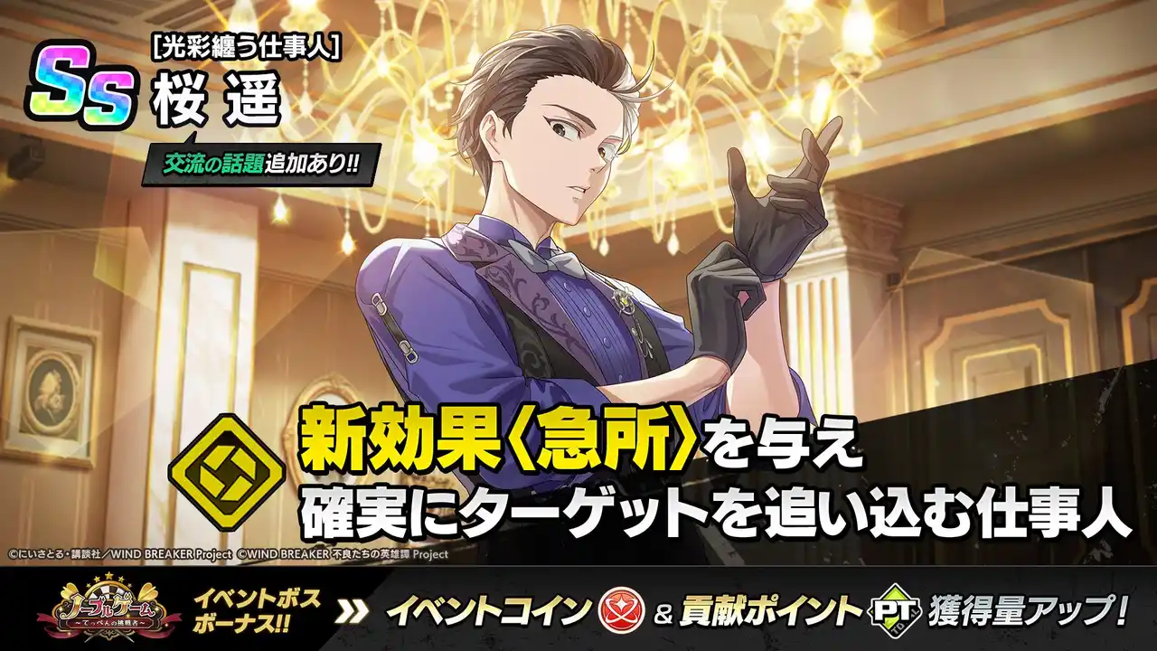 期間限定イベント「ノーブルゲーム~てっぺんの挑戦者~」の開始と同時にイベントに登場するハフバ衣装の桜 遥が入手できるピックアップガチャを開催いたします。[光彩纏う仕事人]桜 遥は新効果<急所>を与え、確実にターゲットを追い込む仕事人となっております。また、この衣装でしか見ることのできない特別な交流もございますので、この機会をお見逃しなく。 |