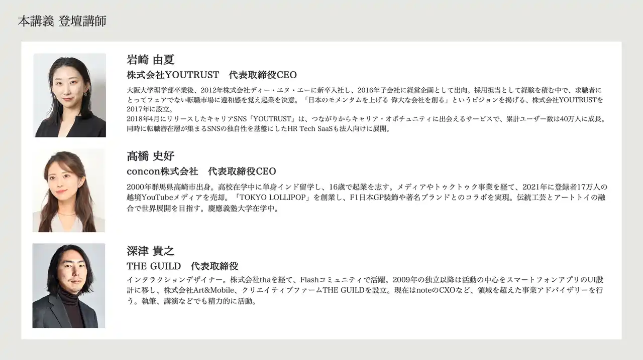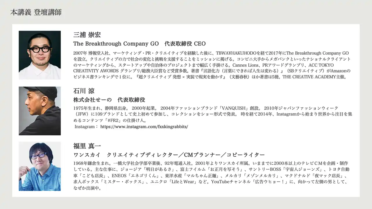 広告業界の第一線を走り続けているクリエイターや、新しい時代のクリエイター像を体現しているビジネスパーソン、さらには自身でビジネスをプロデュースしている経営者の方にもご登壇いただき、本講座を受講することで得られる考え方や、手法などを説明します。オンラインで開催しますので、ぜひお気軽にご参加ください。 |