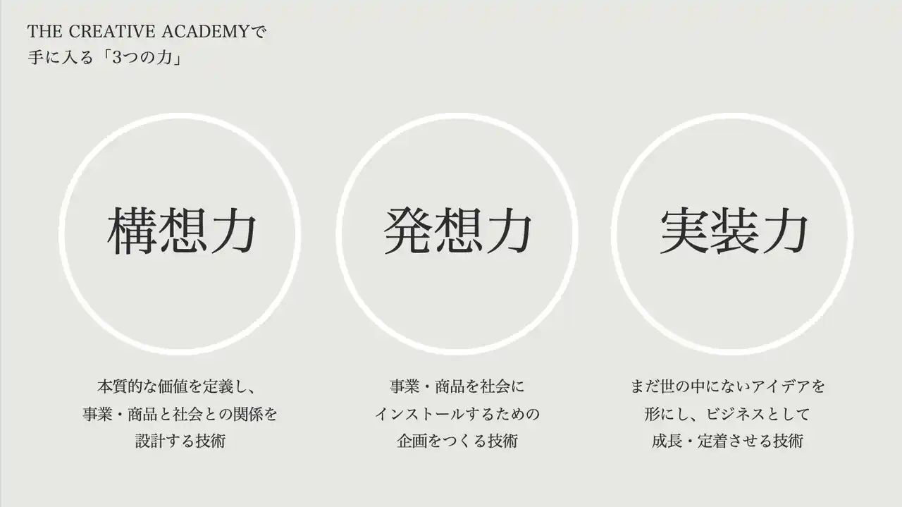 THE CREATIVE ACADEMYでは、経験やセンスに頼るのではなく、体系的に学ぶ場の提供を通じて、アイデアと企画の力でビジネスや社会に新しい価値を生み出す人材を養成します。 |