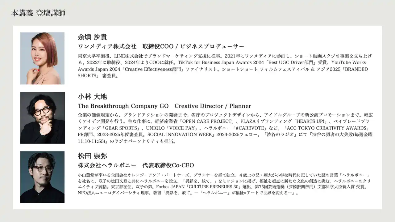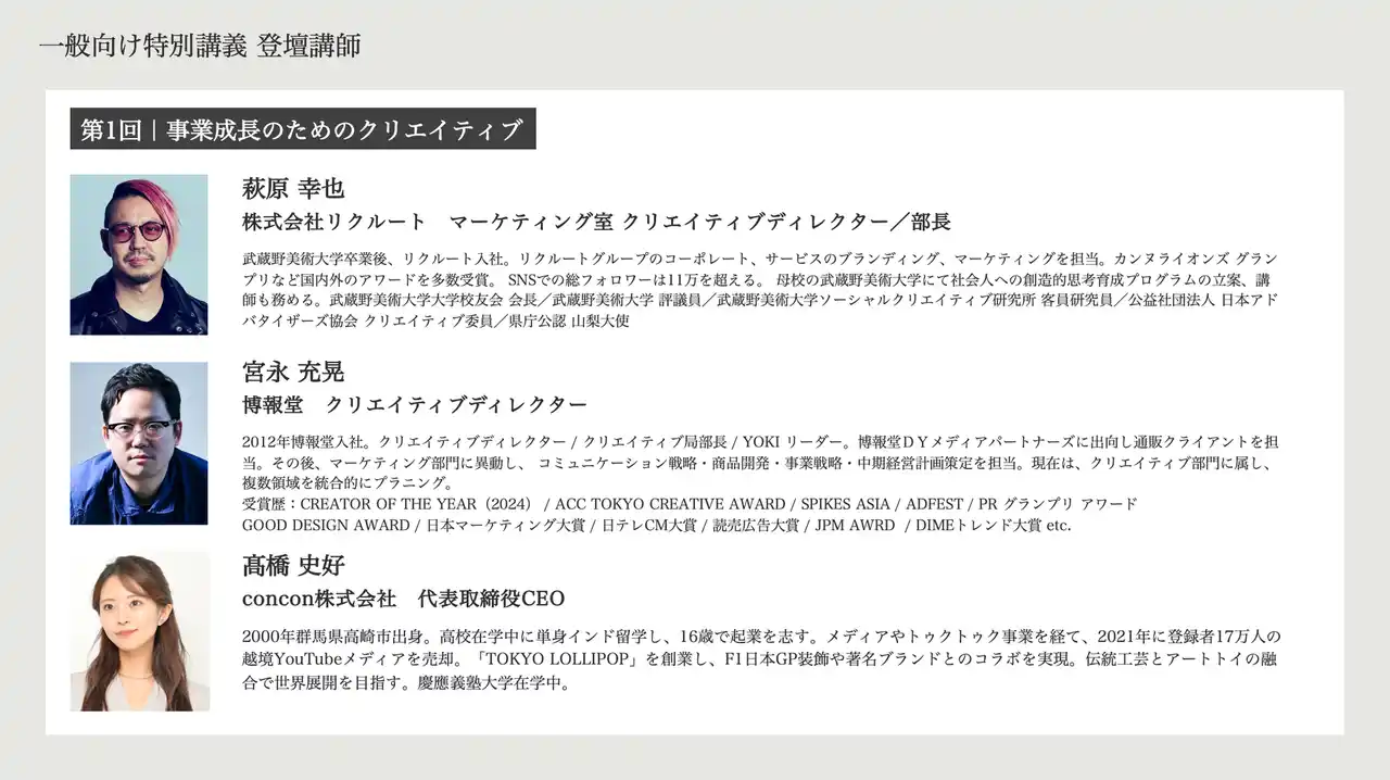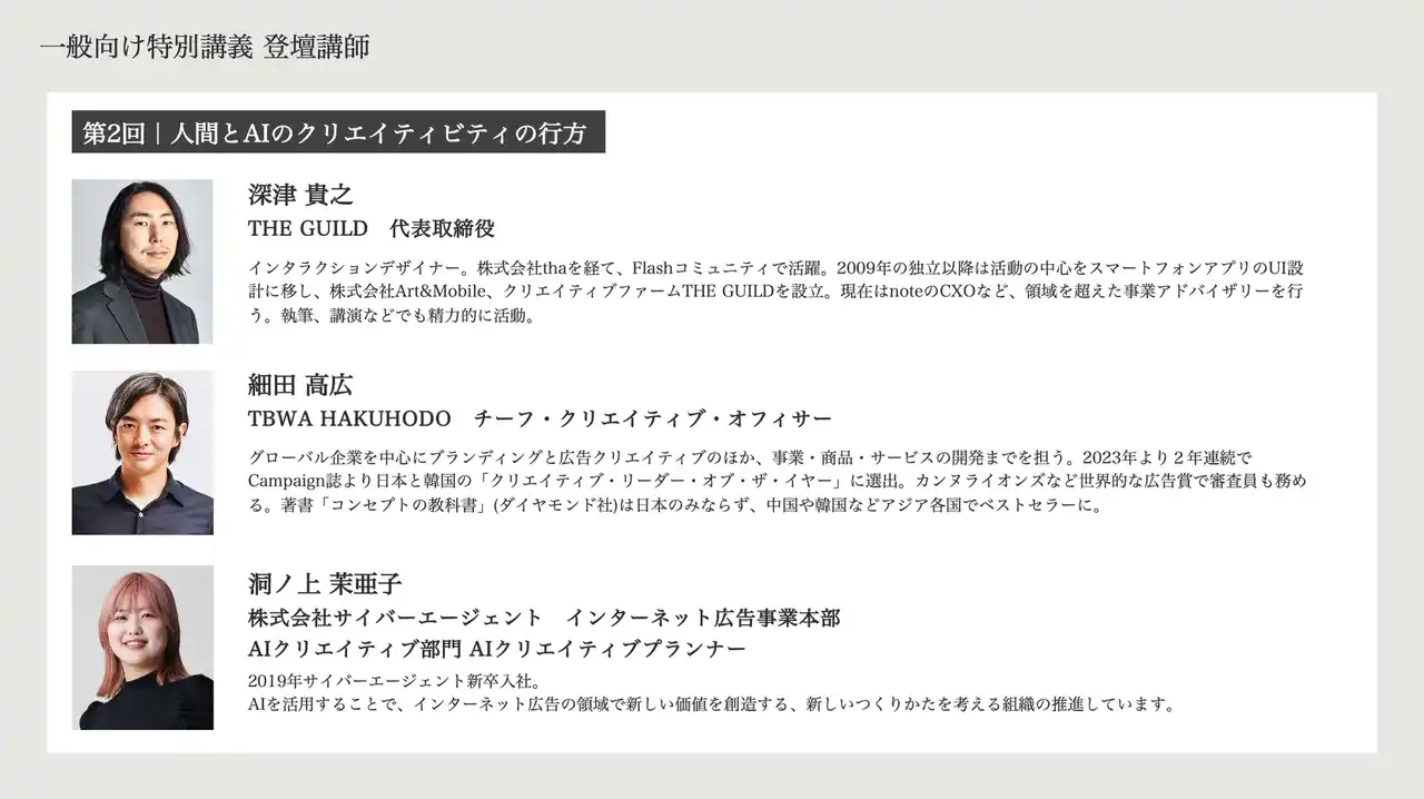 「THE CREATIVE ACADEMY 2025 2nd」の開講にあたり、どなたでも無料で参加可能なオンラインの「一般向け特別講義」を、募集期間中に2回開催。 |