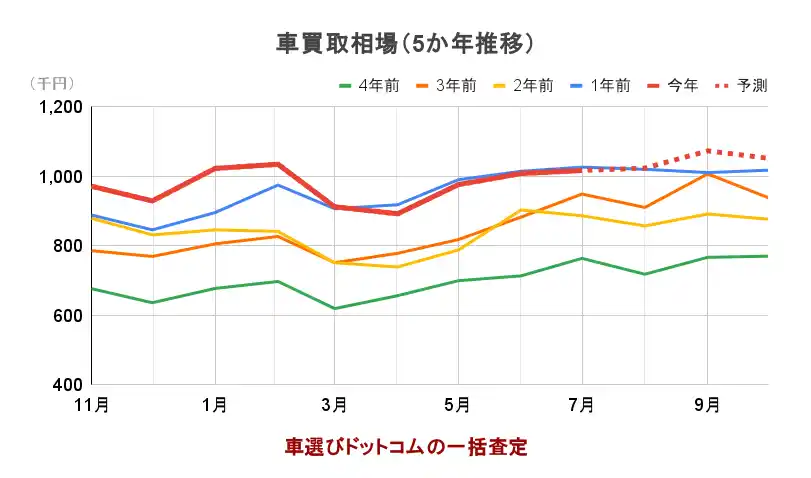 車選びドットコムの過去5年分のデータをもとに分析したところ、買取価格は今年9月に最高値を記録する見通しです。この背景には好調な中古車輸出があり、その影響を受けた国内の中古車販売は価格高騰によって厳しい状況が続いています。 |