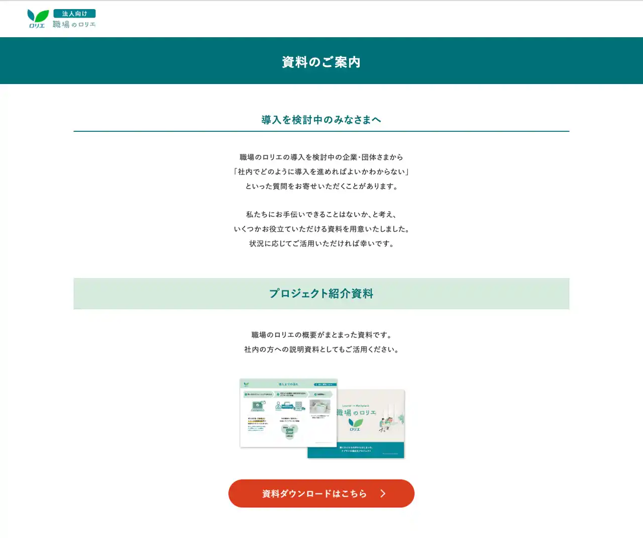 導入検討企業さまに向けた、「職場のロリエ」の概要や取り組みについて、さらに導入までのステップなどをわかりやすくご紹介しています。 |
