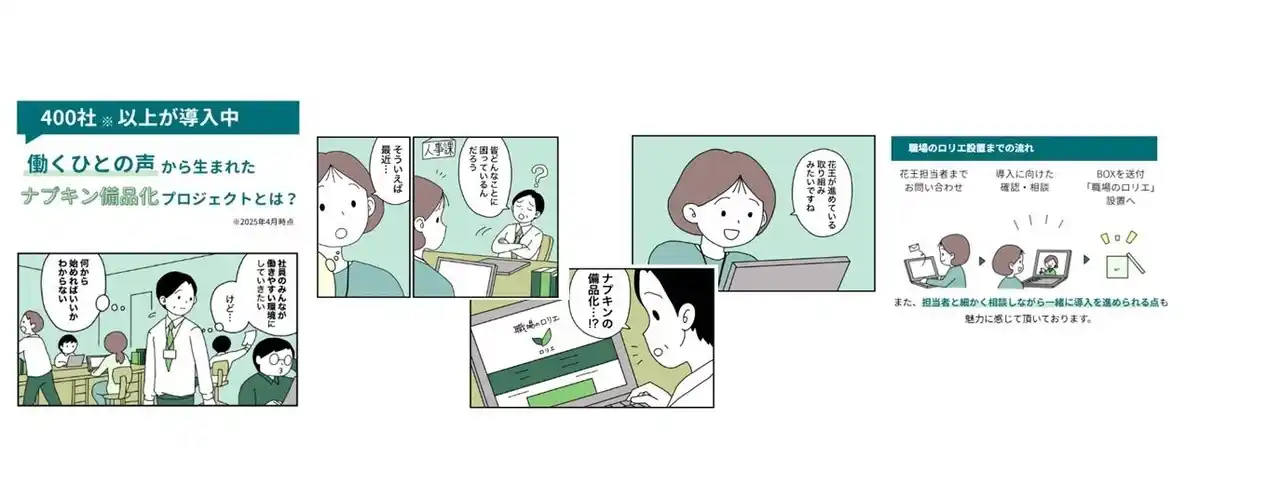 花王株式会社の生理用品ブランド「ロリエ」は、ナプキンの備品化(TM)プロジェクト「職場のロリエ」のWebサイトを、2025年8月29日にリニューアルいたします。「職場のロリエ」の導入を検討される企業の担当者にとって、必要な情報にすぐアクセスできるよう改善し、「職場のロリエ」の理解促進につながる動画などの新コンテンツも拡充。今回のWebサイトリニューアルを通じて、導入企業数が470社*1 を超えた「職場のロリエ」プロジェクトを、賛同いただく企業の皆さまとともに、今後もさらに推進してまいります。 |