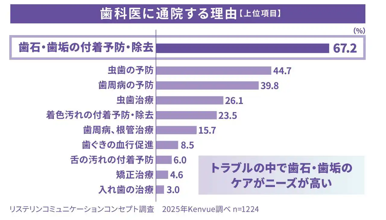 Kenvueの調査*5において、歯科医に通院する理由の1位 67.2%が「歯石・歯垢の沈着予防・除去」でした。しかし、一方で定期歯科健診率は44%に留まるという結果が明らかになりました。さらに歯科医へ定期通院ができない主な理由としては、「予約が面倒」「時間がない」といったものが挙げられています。 |